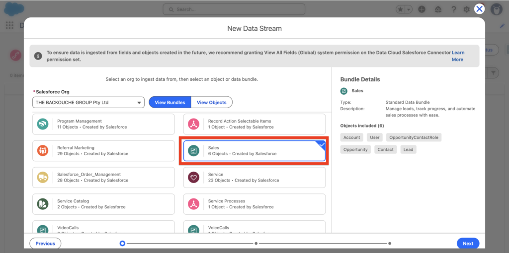 A Bundle is a group of Salesforce Objects and Field Attributes pre-selected that relates to a specific Salesforce platform (Sales Cloud in this case). Salesforce is simplifying the implementation process by providing us with Bundles, we also have the possibility to select specific objects and fields individually.