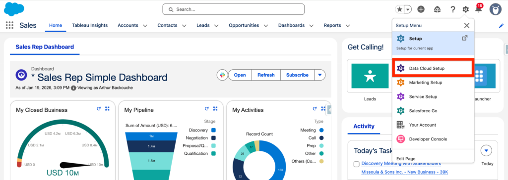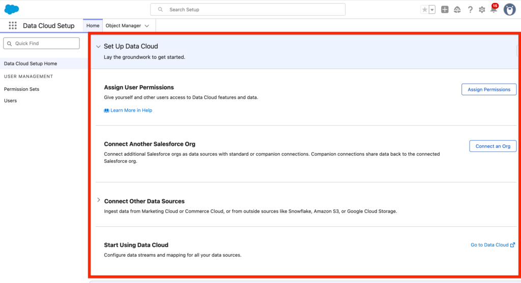 In Set-up, you can click on ‘Data Cloud Setup’ to access the space dedicated to Data Cloud Configuration.