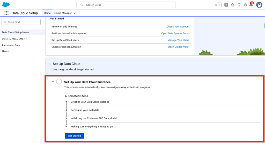 At the bottom of the webpage, click ‘Get Started’ and the process of installing Data Cloud within your Salesforce platform will kickstart automatically.