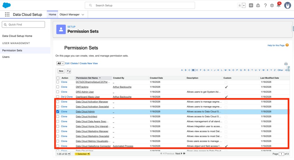 A range of permission sets are existing for Data Cloud. In our case we will use the Data Cloud Admin/Architect Permission Set in order to get full access to the platform for the implementation. Salesforce recommend the Data Cloud Architect permission set for configuring Data 360. The Permission set can be named Data Cloud Admin or Architect depending on how recent is your Salesforce instance.
