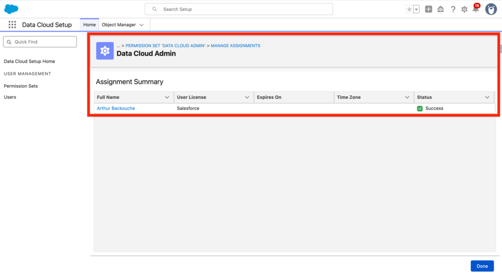I assigned the Data Cloud Admin Permission Set to myself as you can see in the screenshot below.