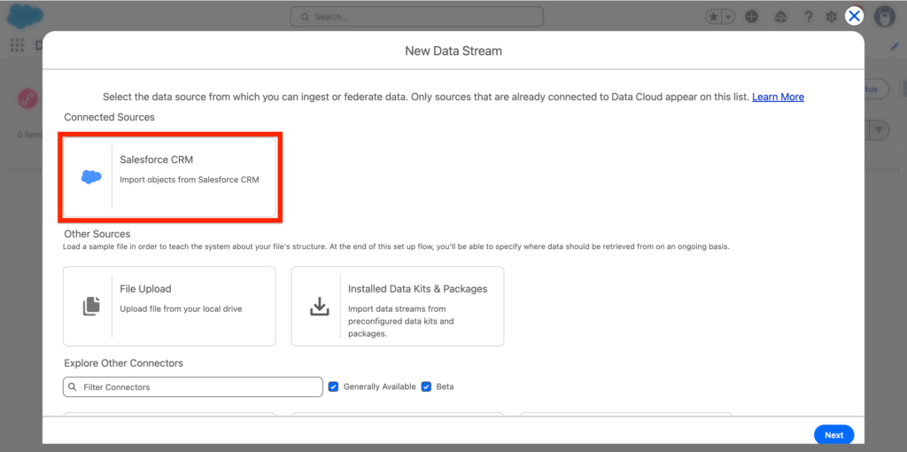 Within the ‘New Data Stream’ pop-up window you will need to click on the ‘Salesforce CRM’ Connector and then click Next.
