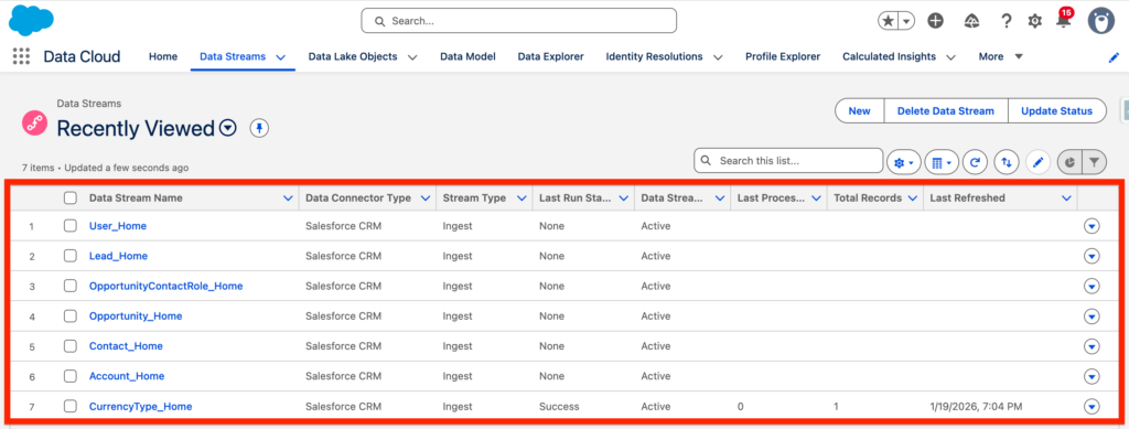We are now able to see the Data Streams deployed within Data Cloud. The Data Streams deployed are: