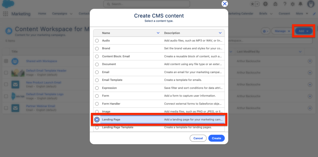 Click Add and select Landing page within the Create CMS Content pop-up window. If you would like to re-use the landing page multiple times for different purposes you can also select Landing Page Template.