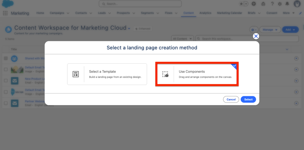 As we don’t have a Landing page template initially created, we will need to select the option use Components and essentially start the landing page from scratch.