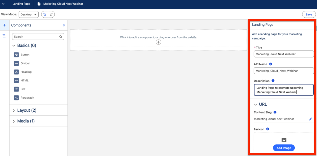 In the example below I’ve set-up my own landing page to promote a Marketing Cloud Next Webinar. The basic settings are to provide the landing page with: