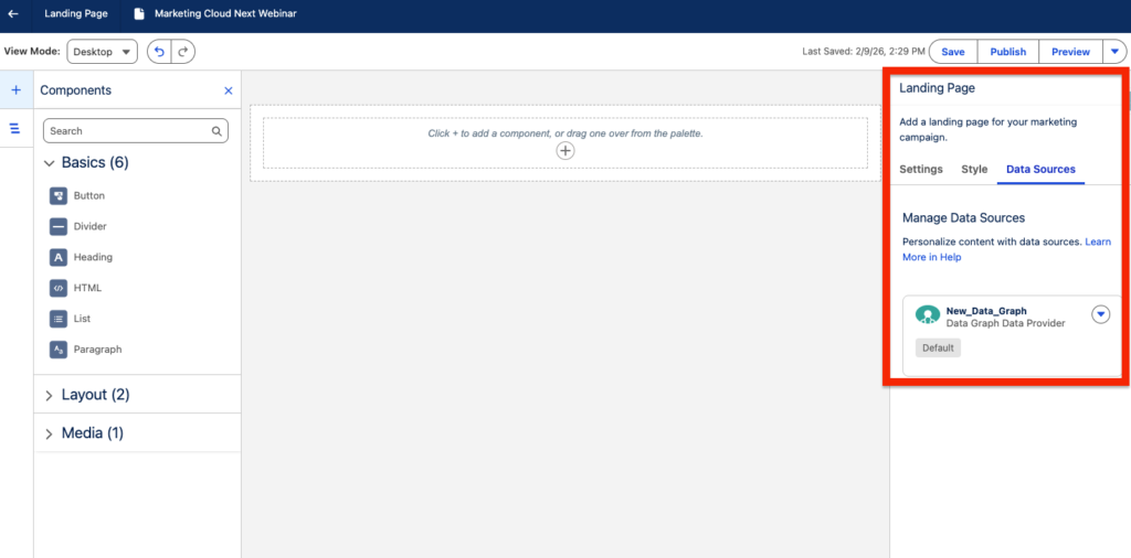 Data Sources allows you to select a Data Graph in order to personalise the landing page with merge fields.