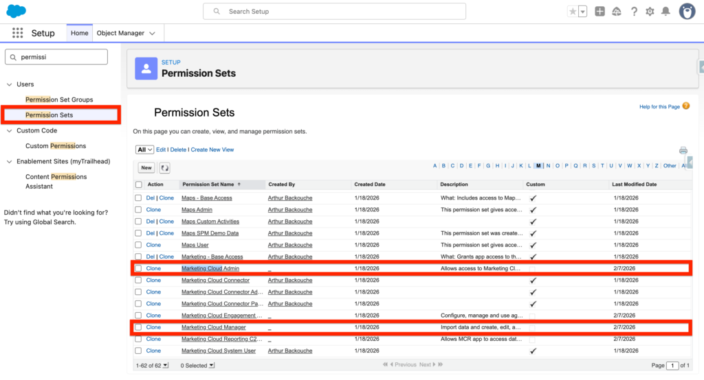 The beauty of Salesforce products is that everything is customisable. Let’s imagine that you would like more control over how people are using Marketing Cloud Next – You can create a fully custom permission set and go into the details of what can be accessed or not. Basically, a Marketing Cloud Permission Permission Set relies on the following categories of permission sets: