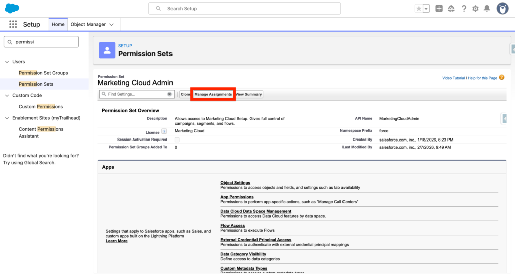 Click on the Permission set of your choice, such as Marketing Cloud Admin and select Manage Assignment.