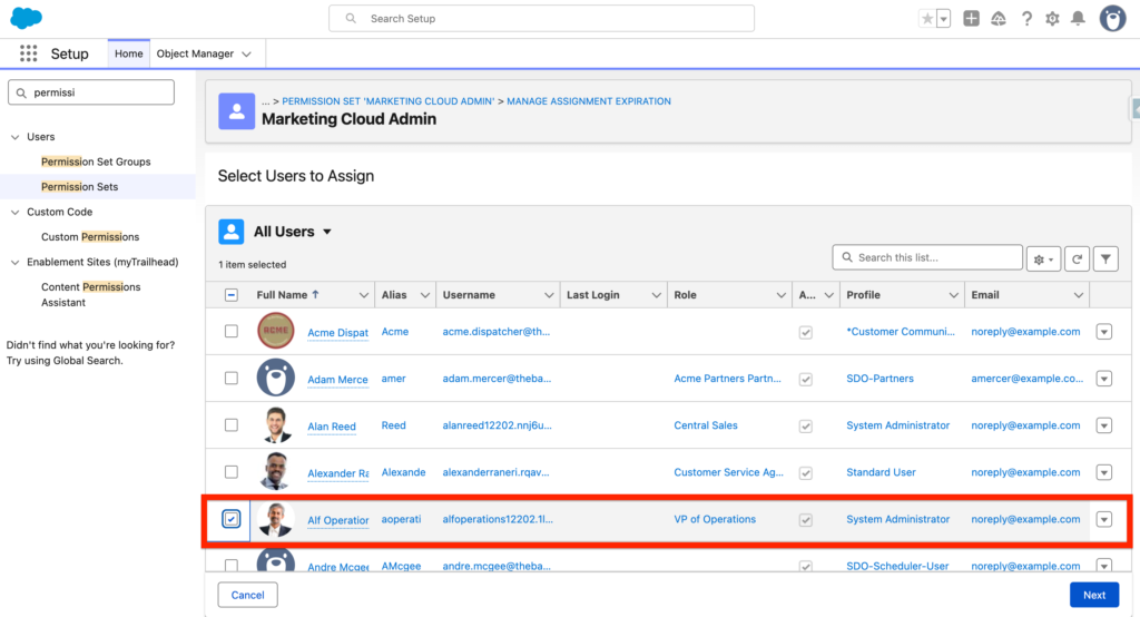 Then select the user that should be associated with the Permission set Marketing Cloud Admin. In my case I will be selecting Alf Operator.