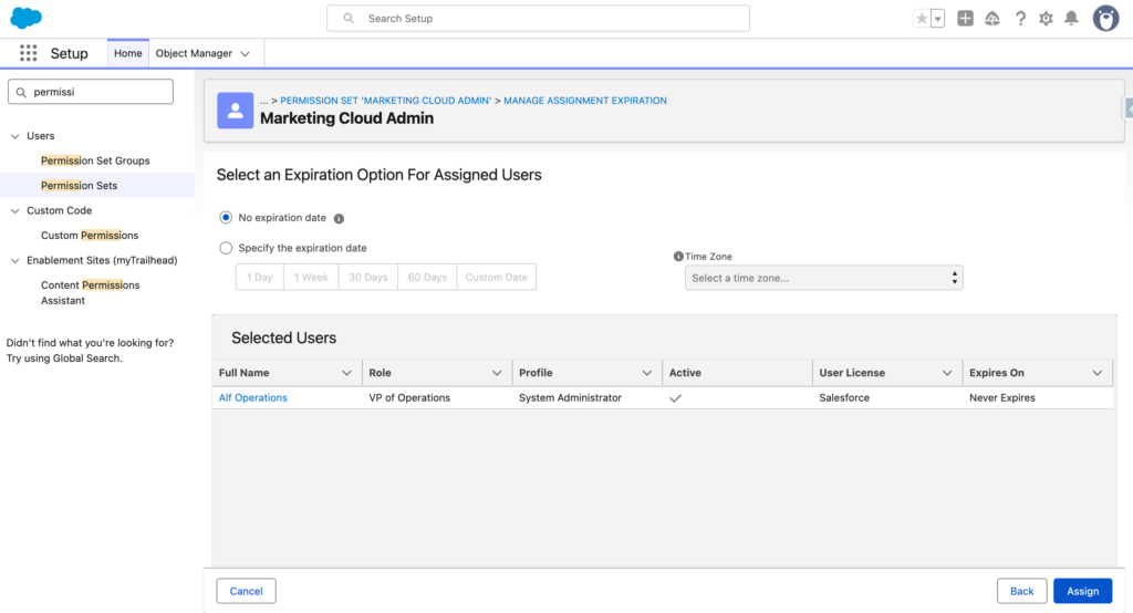 Finally select No expiration date so that the permission set is associated permanently to the user – However if you wish to associate the permission set for a specific period of time you could also select the option Specify the expiration date – and confirm by clicking Assign.